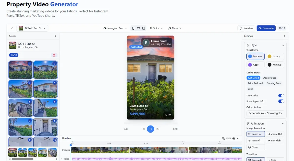 This tool is designed for U.S. residential and commercial real estate agents who need to produce high-volume social media content quickly. It is specifically built for agents who want to leverage the algorithm benefits of video on platforms like Instagram and TikTok without spending hours editing footage or hiring expensive production crews.